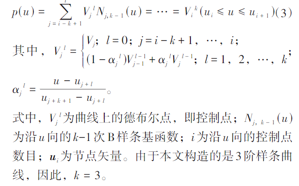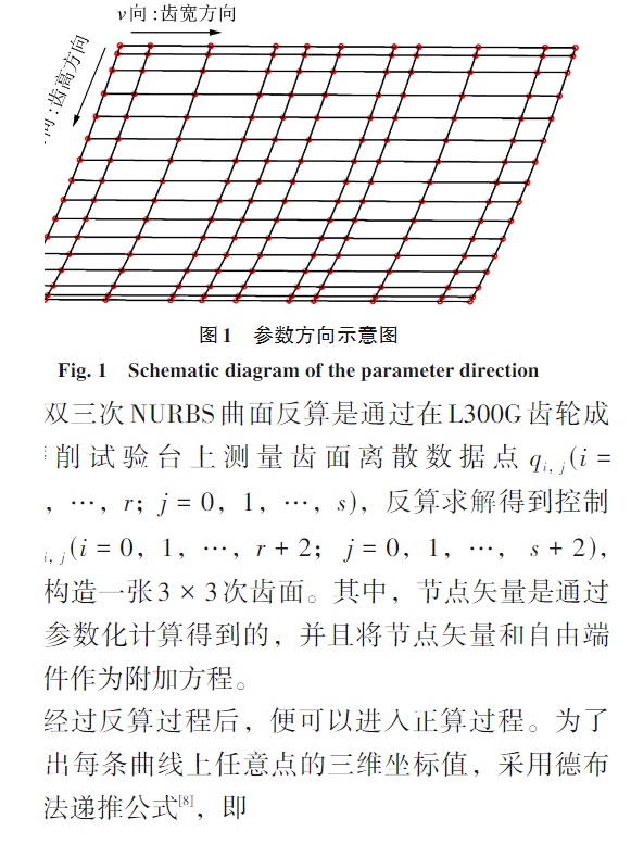 基于L300G磨削試驗(yàn)臺(tái),得到漸開線齒輪齒面上的離散點(diǎn),構(gòu)造出齒面的三維造型,這屬于逆向工程中的曲面重構(gòu)范疇。NURBS曲線曲面擬合包括了正算過程,即求解出NURBS曲面上任意一點(diǎn)的三維坐標(biāo)值;同時(shí)也包括反算過程,即通過反算控制點(diǎn)來擬合曲面。利用雙三次NURBS曲線構(gòu)造漸開線直齒輪三維模型的原理是:根據(jù)L300G上得到的各組離散點(diǎn)的三維坐標(biāo)值分別構(gòu)造三次NURBS曲線;然后,基于NURBS曲線構(gòu)造出擬合曲面,即