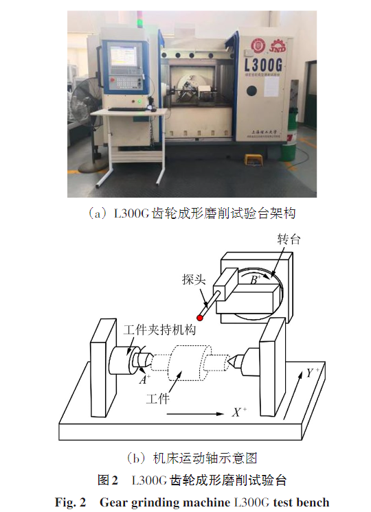 L300G試驗(yàn)臺(tái)如圖2(a)所示。不考慮磨齒運(yùn)動(dòng),所以,設(shè)有直線運(yùn)動(dòng)的X、Y軸,工件轉(zhuǎn)動(dòng)軸A、探頭轉(zhuǎn)動(dòng)軸B來實(shí)現(xiàn)檢測(cè)運(yùn)動(dòng)[9],如圖2(b)所示。為了能夠真實(shí)地反映出實(shí)測(cè)齒面以及提高曲面擬合精度,不同于傳統(tǒng)的漸開線齒輪三截面測(cè)量,在L300G齒輪成形磨削臺(tái)上進(jìn)行測(cè)量試驗(yàn)時(shí),采用多截面測(cè)量,分別在左、右齒面上測(cè)量了9×14個(gè)齒面離散數(shù)據(jù)點(diǎn),其中,沿齒寬測(cè)量了9列,沿齒高測(cè)量了14行。測(cè)量點(diǎn)的分布如圖3所示。將每條齒形的數(shù)據(jù)點(diǎn)代入文獻(xiàn)[10]中的齒形誤差評(píng)價(jià)模型,得到實(shí)測(cè)齒輪模型的左齒面精度均為5級(jí),右齒面精度均為5級(jí)。