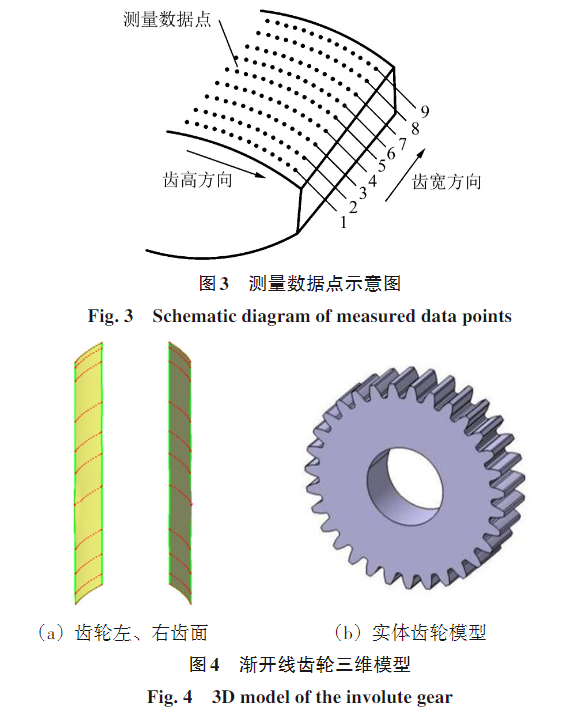 目前,關(guān)于含齒形誤差齒面模型重構(gòu)方面的研究,國內(nèi)外學(xué)者已取得長(zhǎng)足進(jìn)展,內(nèi)容多集中在重構(gòu)方法,主要有根據(jù)齒廓偏差范圍移動(dòng)網(wǎng)格節(jié)點(diǎn)法[3]、點(diǎn)云直接擬合法[4]、非均勻有理B樣條(Non-Uniform Rational B-Spline, NURBS)曲面擬合法[5]。針對(duì)漸開線直齒輪截面選取,喬福瑞[6]將理論齒形上的節(jié)點(diǎn)映射到通過三截面測(cè)量得到的實(shí)測(cè)齒形誤差曲線上,基于自動(dòng)零件清單繪圖(Automated Parts List Drawing,APDL)語言移動(dòng)節(jié)點(diǎn)來重構(gòu)誤差齒面,研究了齒面接觸和嚙合剛度的變化情況。陳思雨等[7]提取三截面測(cè)量得到的齒廓偏差,通過數(shù)值接觸分析了考慮齒形誤差的靜態(tài)傳遞誤差。