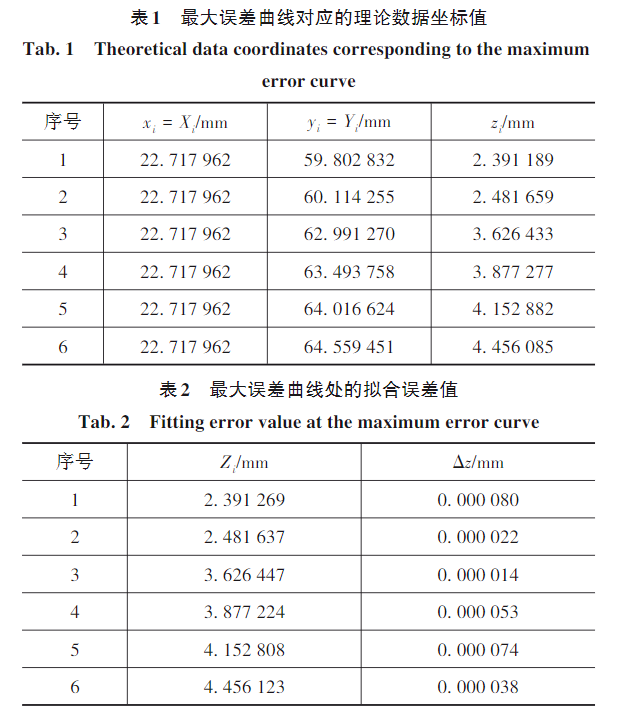 根據(jù)文獻(xiàn)[13],通過NURBS曲面正算過程,可以得到構(gòu)造齒面上8×13的網(wǎng)格中心點(diǎn)三維坐標(biāo)為si(xi,yi,zi),理論齒面坐標(biāo)為Si(Xi,Yi,Zi),取xi=Xi,yi=Yi,得到兩種齒面在對(duì)應(yīng)點(diǎn)處的絕對(duì)誤差為Δz=|Zi-zi|,以左齒面為例,從8條曲線中找出具有最大誤差的曲線,并提取出6個(gè)誤差最大的點(diǎn),其數(shù)據(jù)坐標(biāo)值與擬合誤差值分別如表1和表2所示。從表2可以看出,左齒面的擬合誤差值低于0.1 μm。
