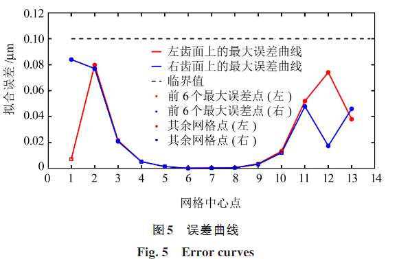 同理,建立右齒面的模型。選取右齒面上具有最大誤差的曲線,同樣提取出6個(gè)誤差最大的點(diǎn),則左、右齒面的誤差曲線如圖5所示。