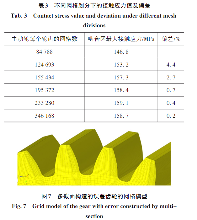 為獲得精確的有限元仿真結(jié)果,同時(shí)不影響計(jì)算效率,在嚙合區(qū)域進(jìn)行合理的網(wǎng)格劃分很關(guān)鍵。以多截面構(gòu)造的誤差齒輪模型為例,本文在不斷細(xì)化嚙合區(qū)網(wǎng)格、減小網(wǎng)格尺寸的過程中,將前后兩次計(jì)算的接觸應(yīng)力的偏差值作為判斷依據(jù),若偏差值小于0.5%[15],則有限元計(jì)算得到的接觸應(yīng)力值收斂至精確解,如表3所示。根據(jù)表3中數(shù)據(jù),本文以每個(gè)輪齒網(wǎng)格數(shù)195372來建立齒輪模型,進(jìn)行后續(xù)的嚙合性能分析。其中,多截面構(gòu)造的誤差齒輪網(wǎng)格模型如圖7所示。