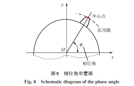 為表征輪齒在傳動(dòng)過程中的嚙合位置變化,規(guī)定在圖8所示的xOy坐標(biāo)系下,主動(dòng)輪齒頂中心點(diǎn)的法線與x軸正向所成的角度為相位角φ。
