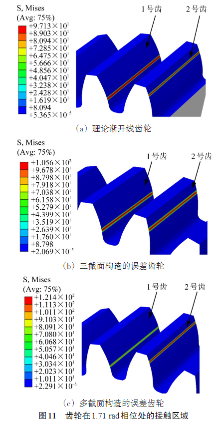 為了更直觀比較兩者差異,建立理論齒輪模型,如圖11(a)所示。提取上述兩個(gè)模型在1.71 rad相位處的接觸區(qū)域,分別如圖11(b)、圖11(c)所示。從理論模型上看,當(dāng)進(jìn)入雙齒嚙合區(qū)域時(shí),理論齒輪接觸區(qū)域的最大接觸應(yīng)力值相當(dāng),且1號(hào)齒中靠近齒根處的接觸面積會(huì)比2號(hào)齒齒頂處大,由1號(hào)齒承擔(dān)更大載荷,但由于齒形誤差的存在,接觸面積的大小和輪齒間載荷的分配方式發(fā)生改變。當(dāng)進(jìn)入雙齒嚙合區(qū)時(shí),三截面構(gòu)造的誤差齒輪的2號(hào)齒與1號(hào)齒的接觸面積差異不顯著,其接觸應(yīng)力也相差不大,基本上共同承擔(dān)載荷,如圖11(b)所示,結(jié)果與理論齒輪相近;而多截面構(gòu)造的誤差齒輪2號(hào)齒上的最大接觸應(yīng)力是1號(hào)齒上最大接觸應(yīng)力的1.1倍,其接觸面積大于1號(hào)齒,2號(hào)齒承擔(dān)大部分載荷,如圖11(c)所示。多截面構(gòu)造的誤差齒面更細(xì)致地表現(xiàn)出了由齒形誤差導(dǎo)致的輪齒接觸面積的變化。