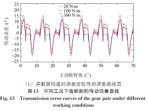 在靜力學(xué)分析中,本文根據(jù)不同的載荷工況,分別設(shè)置了20、100、300 N·m的阻力矩,以探究三截面構(gòu)造的誤差齒輪副與多截面構(gòu)造的誤差齒輪副在不同工況下傳動(dòng)誤差的變化情況。在輕載工況下,如圖12所示,三截面構(gòu)造的誤差齒輪的最大傳動(dòng)誤差幅值基本保持在12′′左右,與標(biāo)準(zhǔn)齒輪的最大傳動(dòng)誤差幅值相近,而多截面構(gòu)造的誤差齒輪的最大傳動(dòng)誤差幅值達(dá)到15′′左右;理論上,由于齒形誤差對(duì)嚙合線產(chǎn)生影響,因此,傳動(dòng)誤差曲線會(huì)產(chǎn)生小周期波動(dòng)。同時(shí)從圖13(a)可以看出,隨著負(fù)載轉(zhuǎn)矩的增加,三截面構(gòu)造的誤差齒輪的傳動(dòng)誤差在逐漸增大,最大傳動(dòng)誤差幅值增長(zhǎng)了25%;而從圖13(b)可以觀察到多截面構(gòu)造的誤差齒輪較明顯的傳動(dòng)誤差變化情況,傳動(dòng)誤差出現(xiàn)明顯波動(dòng),其最大傳動(dòng)誤差幅值增大了33%。由此表明,多截面的構(gòu)造方法更能夠反映實(shí)際齒面的情況,能較準(zhǔn)確地分析出齒形誤差對(duì)齒輪嚙合性能的影響。
