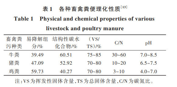 牛糞、豬糞和雞糞是我國(guó)主要的 3 種畜禽糞污, 分 別 占 畜 禽 糞 污 總 產(chǎn) 量 的 45. 2%、39. 2% 和 15. 6%[11] 。由于畜禽消化特征的差異和飼料成分、飼 養(yǎng)方式以及糞污收集方式等外部因素,各畜禽糞污 的成分結(jié)構(gòu)、理化性質(zhì)、產(chǎn)甲烷潛能各不相同[12] 。各 畜禽糞便的成分對(duì)比見(jiàn)表 1。