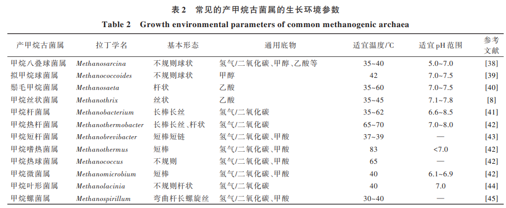 溫度是影響厭氧消化效率的關(guān)鍵參數(shù),對(duì)微生 物的生長(zhǎng)速度和代謝有著重要影響,進(jìn)而關(guān)系到厭 氧消化體系中產(chǎn)甲烷性能。根據(jù)厭氧微生物適合生 存 的 環(huán) 境 溫 度 不 同 ,可 以 在 低 溫(15~25 ℃)、中 溫 (35~40 ℃)和高溫(50~60 ℃)條件下進(jìn)行。根據(jù)表 2 總結(jié)的產(chǎn)甲烷古菌生長(zhǎng)環(huán)境參數(shù)可知:多數(shù)產(chǎn)甲烷 古菌的最佳生長(zhǎng)溫度為 30~40 ℃的中溫環(huán)境,低溫和 高溫對(duì)大多數(shù)厭氧微生物而言為極端環(huán)境,不適宜 生長(zhǎng)[36, 37] 。
