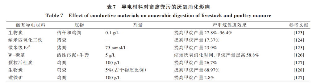 采用導(dǎo)電材料強(qiáng)化 DIET 產(chǎn)甲烷途徑的畜禽糞污厭氧處理技術(shù),是提高畜禽糞污資源利用的有效途 徑和研究熱點(diǎn)。在厭氧系統(tǒng)中投加外源導(dǎo)電材料 (如顆粒活性炭[112]、碳布[113]、生物炭[114]、石墨烯[115]、 磁鐵礦[116] 、磁性顆粒活性炭[117] 、聚苯胺[118] 等)可強(qiáng)化 甲烷八疊球菌屬 Methanosarcina 等產(chǎn)甲烷功能菌參與 DIET 過(guò)程,進(jìn)而提高厭氧體系甲烷轉(zhuǎn)化效率,其具體 影響效果見(jiàn)表 7。外源導(dǎo)電材料具有高導(dǎo)電性、化學(xué) 穩(wěn)定性、吸附能力強(qiáng)等特點(diǎn),能夠作為生物導(dǎo)電連接 重要補(bǔ)充;同時(shí),不需要微生物消耗能量以合成生物 電連接的自身導(dǎo)電結(jié)構(gòu),微生物可以利用更多能量 于代謝作用。Pan 等[119] 研究發(fā)現(xiàn),添加生物炭可以提 高雞糞、牛糞及其混合物的產(chǎn)氣潛力,并能提高所 產(chǎn)沼氣的甲烷含量,通過(guò)吸附作用,降低氨氮和硫 化氫的含量。Lee 等[120, 121]研究發(fā)現(xiàn)在系統(tǒng)中投加 生 物 炭 和 活 性 炭 后 ,其 表 面 富 集 了 鬃 毛 甲 烷 菌 屬 Methanosaeta、甲 烷 螺 菌 屬 Methanospirillum 和 甲 烷 桿 菌 屬 Methanobacterium 等 產(chǎn) 甲 烷 古 菌 。 Zeng 等[122]探究了碳基導(dǎo)電材料負(fù)載核黃素后對(duì)畜禽糞 污 厭 氧 消 化 的 影 響 ,通 過(guò) 投 加 核 黃 素 改 變 了 微 生 物 群 落 結(jié) 構(gòu) 并 提 高 了 與 DIET 相 關(guān) 的 功 能 基 因 豐 度 ,最 終 提 高 了 反 應(yīng) 器 的 容 積 產(chǎn) 氣 率 和 有 機(jī) 物 去 除率。