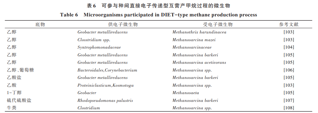 通過(guò)對(duì)參與 DIET 產(chǎn)甲烷途徑的互養(yǎng)代謝微生物 群落結(jié)構(gòu)進(jìn)行厭氧消化調(diào)控,增加可參與 DIET 過(guò)程 的微生物豐度,進(jìn)而提高產(chǎn)甲烷效率。Jiang 等[92]研 究發(fā)現(xiàn)通過(guò)添加富集的丙酸降解產(chǎn)甲烷培養(yǎng)基,培 養(yǎng)基中所含優(yōu)勢(shì)菌屬為甲烷絲狀菌屬 Methanothrix (66. 15%~94. 70%)和 甲 烷 桿 菌 屬 Methanobacterium (4. 81%~33. 56%),相比與非生物強(qiáng)化組,系統(tǒng)中甲 烷絲狀菌屬 Methanothrix 的豐度超過(guò) 80%,有機(jī)負(fù)荷 和沼氣產(chǎn)量分別提高 8 倍和 12 倍。目前報(bào)道的確認(rèn) 可以參與直接種間電子傳遞的菌屬(表 6)可知:供電 子微生物多為具有胞外電子傳遞能力的微生物,如 地桿菌屬 Geobacter,而受電子的產(chǎn)甲烷古菌則主要是 可以利用乙酸鹽的鬃毛甲烷菌屬 Methanosaeta 和甲 烷八疊球菌屬 Methanosarcina。