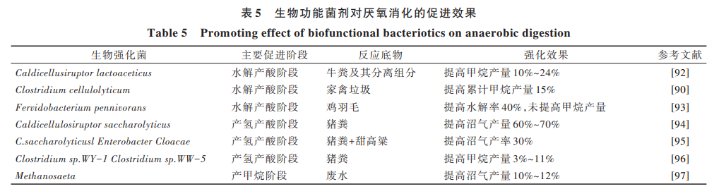 向反應(yīng)系統(tǒng)中投入具有一定功能的微生物功能 菌劑,能夠在很大程度上提高生化效率,達(dá)到加快厭 氧系統(tǒng)啟動(dòng)時(shí)間、縮短 HRT、增加難降解原料利用 率、促進(jìn)酸敗系統(tǒng)的恢復(fù)、應(yīng)對(duì)氨抑制等目標(biāo)[88] 。根 據(jù)目標(biāo)產(chǎn)物的不同,可將其劃分為水解產(chǎn)酸、產(chǎn)氫產(chǎn) 乙酸、產(chǎn)甲烷階段的生物強(qiáng)化,其促進(jìn)效果見(jiàn)表 5。 由于畜禽糞污中含有大量的木質(zhì)纖維素,有效發(fā)酵 成分不易降解,對(duì)水解產(chǎn)酸階段生物強(qiáng)化,促進(jìn)木質(zhì) 纖維原料的水解,為厭氧消化可提供更多易降解的 底物。Henrik 等[89] 研究發(fā)現(xiàn),向牛糞及其分離組中投 加乳酸桿菌 Caldicellulosiruptor lactoaceticus 可以使得 甲 烷 產(chǎn) 率 提 高 10%~24%。 然 而 ,Costa 等[90]研 究 發(fā) 現(xiàn),盡管在高溫厭氧發(fā)酵畜禽糞便體系中投加熱線 梭 菌 Clostridium thermocellum 及 解 糖 纖 維 素 分 解 菌 Caldicellulosiruptor saccharolyticus,雖然原料水解率提 高了,但甲烷的產(chǎn)量并沒(méi)有明顯增多,這是由于產(chǎn)甲 烷速率跟不上纖維素水解產(chǎn)酸菌速率,導(dǎo)致 VFAs 累 積,抑制了產(chǎn)甲烷。通過(guò)對(duì)水解產(chǎn)酸階段的生物強(qiáng) 化,向系統(tǒng)中投加產(chǎn)氫菌,所產(chǎn)的沼氣中氫氣含量并 未增加,即甲烷與氫氣組分比例無(wú)明顯減小,說(shuō)明投 加產(chǎn)氫菌所增加的氫氣是以中間產(chǎn)物存在的。氫氣 作為產(chǎn)甲烷古菌的底物,被進(jìn)一步用于產(chǎn)甲烷。此 外,產(chǎn)氫菌的生物強(qiáng)化還可使甲烷菌的數(shù)量增加,即 氫營(yíng)養(yǎng)型產(chǎn)甲烷古菌在數(shù)量上得到了強(qiáng)化[91] 。