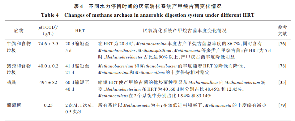 有機(jī)負(fù)荷率(OLR)是運(yùn)行厭氧消化系統(tǒng)的重要 工程控制參數(shù),通過(guò)調(diào)整 HRT 可改變系統(tǒng)的有機(jī)負(fù) 荷,從而平衡畜禽糞污厭氧消化產(chǎn)酸速率與產(chǎn)甲烷 效率,實(shí)現(xiàn)最佳的產(chǎn)氣性能[73]。厭氧消化反應(yīng)器產(chǎn) 氣量會(huì)隨進(jìn)料有機(jī)負(fù)荷的增加而加大,但當(dāng) HRT 縮 短到一定程度,則會(huì)因負(fù)荷過(guò)高而造成有機(jī)揮發(fā)酸 的積累,尤其是丙酸,對(duì)厭氧消化過(guò)程產(chǎn)生抑制,從 而導(dǎo)致產(chǎn)氣量降低[74] 。HRT 從 10 d 減少到 7. 5 d,促 進(jìn)了甲烷八疊球菌屬 Methanosarcina 的生長(zhǎng),相對(duì)甲 烷絲狀菌屬 Methanothrix 具有優(yōu)勢(shì)[75]。單純的糞污 厭 氧 消 化 效 率 相 對(duì) 較 低 ,抗 降 解 成 分 需 要 較 高 的 HRT。通過(guò)與餐廚垃圾、粗甘油、秸稈等物料共消化 可有效提高甲烷產(chǎn)量。在牛糞與餐廚垃圾共消化的 研究中,發(fā)現(xiàn)縮短 HRT(25,20,15,10,7,5,4 d)會(huì)減 少甲烷轉(zhuǎn)化率,系統(tǒng)中擬桿菌門(mén)(Bacteroidetes)和厚 壁菌門(mén)(Firmicutes)成為優(yōu)勢(shì)菌,醋酸合養(yǎng)氧化菌(主 要是 Pelotomaculum 和 Pseudothermotoga)的比例明顯 增加;優(yōu)勢(shì)產(chǎn)甲烷古菌由乙酸營(yíng)養(yǎng)型產(chǎn)甲烷古菌轉(zhuǎn) 變?yōu)槭葰湫彤a(chǎn)甲烷古菌[76, 77]。在不同的 HRT 下,不 同類(lèi)型底物的厭氧消化系統(tǒng)中產(chǎn)甲烷古菌變化情況 見(jiàn)表 4。