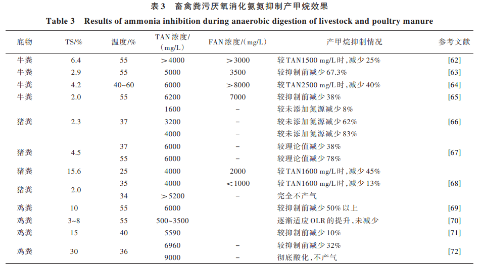 乙 酸 營(yíng) 養(yǎng) 型 產(chǎn) 甲 烷 古 菌 Methanosaeta 和 Methanosarcina 對(duì)氨氮更敏感,而嗜氫產(chǎn)甲烷古菌具 有較好的氨氮耐受性。當(dāng)氨氮濃度為 1300 mg/L 時(shí), 乙酸營(yíng)養(yǎng)型產(chǎn)甲烷古菌 Methanosarcina 開(kāi)始受到抑 制[58] 。當(dāng)氨氮濃度升高至 3500 mg/L 以上時(shí),嗜氫產(chǎn) 甲烷古菌 Methanoculleus 也會(huì)受到不同程度的氨抑 制[59, 60]。孟曉山等[61]研究發(fā)現(xiàn),豬糞厭氧消化系統(tǒng) 中氨氮超過(guò) 4000 mg/L,將促使產(chǎn)甲烷古菌群結(jié)構(gòu)發(fā) 生顯著變化,乙酸營(yíng)養(yǎng)型產(chǎn)甲烷古菌 Methanosaeta 逐 漸被 Methanosarcina 代替,而氫利用型產(chǎn)甲烷古菌屬 中 Methanospirillum 的優(yōu)勢(shì)性逐漸被 Methanoculleus 和 Methanomassiliicoccus 取代,高濃度氨氮也會(huì)促使產(chǎn)甲 烷途徑由乙酸利用型為主向氫利用型為主轉(zhuǎn)變。在 畜禽糞污厭氧消化過(guò)程中,氨氮抑制產(chǎn)甲烷效果的 相關(guān)情況總結(jié)見(jiàn)表 3。