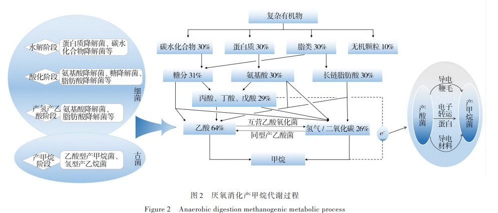 根據(jù)圖 2 厭氧消化產(chǎn)甲烷代謝過(guò)程可知:產(chǎn)酸細(xì) 菌和產(chǎn)甲烷古菌之間存在種間電子轉(zhuǎn)移(IET),該方 式是菌屬之間互養(yǎng)代謝產(chǎn)甲烷極其重要的環(huán)節(jié)。由于較快的水解發(fā)酵產(chǎn)酸和較慢的產(chǎn)甲烷之間的不平 衡,從而導(dǎo)致畜禽糞污厭氧消化處理負(fù)荷只能維持 在相對(duì)較低效能,產(chǎn)甲烷效率受到了限制[98] 。IET 產(chǎn) 甲烷途徑是微生物菌群降低熱力學(xué)能壘、實(shí)現(xiàn)互養(yǎng) 代謝快速產(chǎn)甲烷的核心過(guò)程。互養(yǎng)代謝產(chǎn)甲烷過(guò)程 除了常見(jiàn)已知的種間氫轉(zhuǎn)移[99] 和種間甲酸轉(zhuǎn)移[100] 之 外,美國(guó)馬薩諸塞大學(xué) Derek Lovley 教授團(tuán)隊(duì)[101]于 2010 年在國(guó)際上首次報(bào)道了電活性微生物硫還原地 桿 菌 Geobacter sulfurreducens 和 金 屬 還 原 地 桿 菌 Geobacter metallireducens 之間存在直接種間電子傳遞 (DIET)過(guò)程,這種代謝方式不需要電子穿梭體,可以突 破傳遞過(guò)程的速率限制,能夠以更高的電子轉(zhuǎn)移效率 或較低的能量消耗直接將電子轉(zhuǎn)移至二氧化碳,將二 氧化碳還原為甲烷,可極大提升產(chǎn)甲烷速率。目前已 發(fā)現(xiàn) 2 類(lèi)種間直接電子傳遞形式,一類(lèi)是依靠細(xì)胞外 膜上的c型細(xì)胞色素,另一類(lèi)是通過(guò)導(dǎo)電菌毛(pili)[102] 。