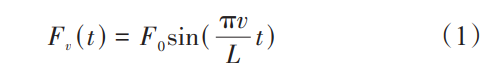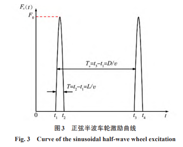 車輪作用在減速帶上的力為沖擊脈沖載荷,這種 載荷往往在極短時間內達到峰值,且隨著車輪的離開 又迅速消失。因此,車輪激勵的形狀并不重要,本文 將車輪的激勵近似看成正弦半波激勵,表示為