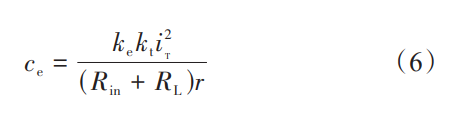 式中,kt為直流發電機的轉矩系數;Rin為發電機的內部 阻值;RL為發電機外接的負載電阻;iT為齒條至發電機 轉子之間的增速比。觀察式(5)可知,x前的系數為電磁阻尼系數,即