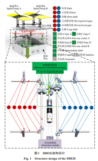 雙減速帶饋能裝置(Dual-speed Bump Energy Harvester, DBEH)是一種能量轉換裝置,能夠將車輛作用 在減速帶上的動能轉換成電能,從而為智慧路面提供 綠色可持續能量。DBEH包括減速帶、復位彈簧、傳動 模塊、整流模塊、發電模塊及箱體,如圖1所示。其中, 每個減速帶下方放置2個復位彈簧,以提供平穩支撐; 采用齒輪齒條副將高速直線運動轉化為旋轉運動;采 用單向離合器對旋轉運動進行整流處理;利用直流發 電機將機械運動轉化為電能并輸出。