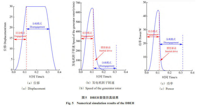 圖5顯示了單輪下壓單個減速帶時,減速帶位移、 發電機轉子轉速,以及發電機發電功率隨時間變化的 規律。根據減速帶位移隨時間變化的規律,可以將其 分為下壓、保持和釋放 3 個過程,如圖 5(a)所示。其 中,在下壓過程中,超越離合器進入結合模式;而減速 帶處于保持和釋放過程時,超越離合器進入分離模 式。受此規律影響,發電機轉速將在結合模式下迅速 升高,而在分離模式時成指數下降趨勢。這是由于在 結合模式時,發電機的轉速與式(2)的解有關,而在分 離模式下,其轉速與式(3)的解有關。根據發電機轉 子轉速變化,可進一步獲得發電機輸出功率隨時間變 化的規律,如圖 5(c)所示。如圖 5(a)所示,由于發電 機所提供的電磁阻尼相對較小,可近似認為減速帶在 車輪激勵下向下運動的過程為結合模式,而到達極限 位置以及減速帶回彈過程中為分離模式。數值仿真 的參數如表 1所示。根據圖 5(b)、圖 5(c)中的數值仿 真結果可以發現,發電機轉子在單向離合器斷開動力 傳遞之后,仍在慣性驅動下持續旋轉和輸出功率,并 在電磁阻尼的影響下逐漸減速。分離后的發電機轉 速可通過微元法表示為