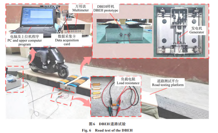 式中,N為采集電壓數據總數。對試驗數據計算可得, 當負載電阻為100 Ω時,RMS功率為6. 58 W,輸出電能 為4. 82 J;當負載電阻為20 Ω時,RMS功率為11 W,輸 出電能為7. 32 J。這說明DBEH具備為道路系統中的 用電設備供電的可能性。