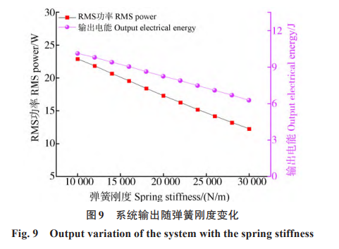 圖9顯示了DBEH的有效功率和輸出電能與彈簧 剛度之間的關系。由圖9可以看出,有效平均功率和總 輸出電能隨著彈簧剛度增加而減小。由于減速帶運動 行程固定,所以彈簧剛度越大,彈簧所儲存的能量就越 多,相對轉換成的電能就越少。彈簧所存儲的能量在減 速帶復位過程中被機械摩擦消耗。因此,彈簧的選取 中,彈簧在滿足能夠將減速帶快速恢復到初始位置的條 件下,盡可能減小彈簧的剛度更有利于系統的輸出。根 據設計經驗,彈簧的剛度選擇符合以下條件即可: