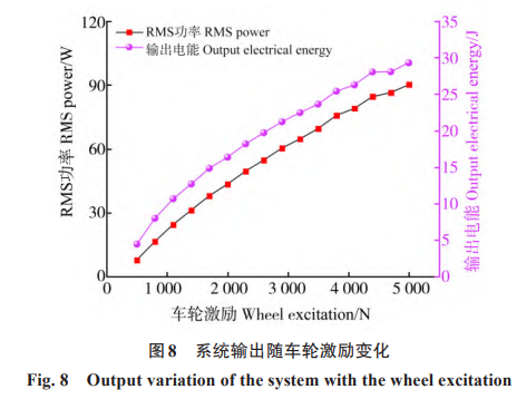 1)外部激勵幅值以及彈簧剛度對系統的輸出影 響是接近線性的,系統的RMS功率和電能輸出隨著車 輪激勵的增加及彈簧剛度的減小而線性增加。
