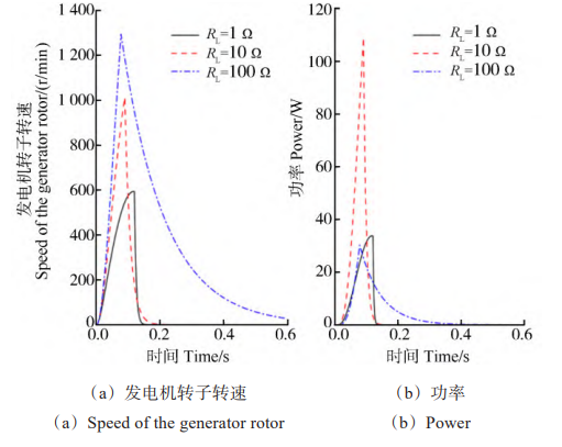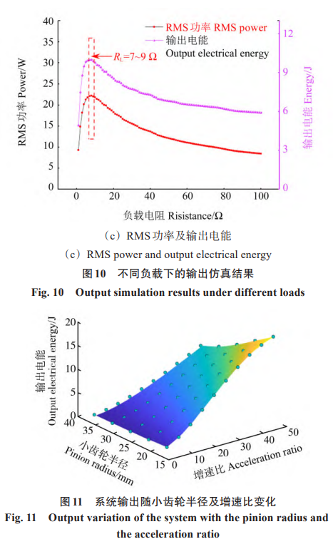 圖 10(a)顯示了不同負載電阻時發電機轉子的運 動變化。由圖 10 可知,隨著負載電阻的增加,其所 提供的電磁阻尼系數逐漸減小。因此,發電機轉子 的轉速更高,且在分離模式下的持續轉動時間更長。 但通過圖 10(b)可以發現,系統的輸出功率并沒有隨 著負載的趨勢變化,而是呈現出負載電阻 RL=10 Ω> RL=1 Ω>RL=100 Ω。這是因為發電機的輸出功率 Pe= Ie 2 RL,其與RL(/ RL+Rin )2 有關,即負載阻值的增加在提高 發電機轉速產生更多電能的同時,發電機內阻所耗散 的能量增加了。理論上當 RL=Rin時,系統的輸出峰值 功率最大,但分離模式下發電機轉子持續轉動的時間 卻隨著負載電阻的增大而增大,因此,如圖 10(c)所 示,DBEH的RMS功率以及輸出的電能在負載電阻為 7~9 Ω時取得最優。