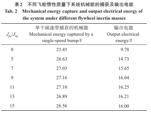 中藍色區域表示系統將機械能轉化成電能的轉化率, 紅色區域表示將機械能轉化成其他能量的轉化率,如 彈簧勢能、傳動部件的動能以及摩擦阻尼耗散的熱能 等。由圖13可以看出,小慣量的飛輪提升了系統對于 機械能的捕獲以及電能的輸出。不同飛輪慣性質量 下系統機械能的捕獲及輸出電能如表 2所示,當 Jfw為 發電機轉子慣量JM的9~13倍時,系統對機械能的捕獲 以及電能輸出均達到最優,并且系統將機械能轉化成 電能的轉化率也達到最高,約為 30%。這可以歸因于 小慣量的飛輪使得減速帶在正弦半波激勵下更緩慢到 達極限位置,使得車輪激勵的做功更充分,同時又延緩 了發電機轉子慣性驅動的時間。因此,在輸入與輸出 同時增加時,系統將機械能轉換成電能的轉化率有所 提高。隨著飛輪慣量的增加,可能出現在同樣幅值的 激勵下,減速帶無法到達極限位置的情況,從而系統捕 獲的機械能變少,且大慣量的飛輪使得系統的RMS功 率呈下降趨勢,輸出的電能也有所降低,因此,系統對 機械能的捕獲及輸出電能的能力有所下降。同時,大 慣量的飛輪沒有增加系統機械能到電能的轉化率。