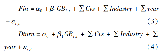 本文構建以下計量模型 (1) 與模型 (2) 來 驗證網絡輿論對企業創新產出和創新效率的影響, 其中下標 i、 t 分別表示企業個體與年份, 表示隨 機誤差項, 表示一系列控制變量, 和表示對行業 固定效應及年份固定效應的控制, 本文重點關注 回歸系數的情況, 若假設 H1a 與 H1b 成立, 那么 回歸系數應當為負顯著。