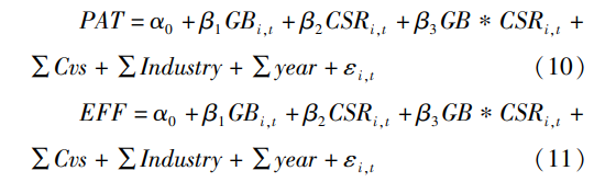 因此, 企業在履行社會責任的過程中, 通過 良好的信息披露來提升透明度, 可以有效增強投資者的信心, 營造一個穩定的外部環境, 支持企 業的創新和發展。 信息披露與社會責任的履行相 結合, 不僅有助于提高企業的市場競爭力, 也為 其長期可持續發展奠定了堅實基礎。 本文參考 Yuan (2021) [31]的方法, 以企業社會責任方面的 信息披露次數衡量社會責任履行質量 (CSR), 并 構建模型 (10) 與模型 (11) 驗證信息環境對原 假設的影響, 社會責任履行質量 (CSR) 與網絡 輿論 (GB) 的交乘項回歸系數為該部分重點觀察 對象, 若企業能夠高質量地履行社會責任, 則網 絡輿論所造成的影響將被弱化, 回歸系數應當為 正且顯著。