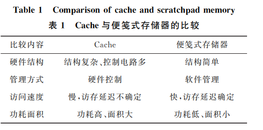 便箋式存儲器最大的特點是具有獨立的地址空間,與計算機系統主存統一存儲空間編址。因此,研究人員可以直接對其進行讀寫控制,在程序中實現對便箋式存儲器的數據分配,從而改善數據局部性,提升程序性能。Cache 和便箋式存儲器特點比較如表 1 所示。