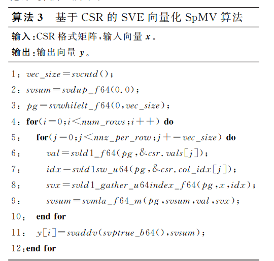 本文借助 ARM 提供的 SVE intrinsics 函數對基于 CSR 存儲格式的 SpMV 算法進行 SVE 向量化,如算法 3 所示。