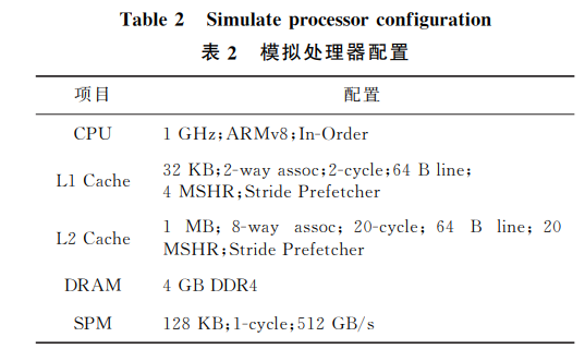 本文在 gem5 中擴展并實現了便箋式存儲器,并使用順序 CPU 模型對 ARMv8 單核處理器進行模擬,采用 gem5 全系統執行模式,將 SpMV 算法執行過程中不規則訪問的輸入向量 x 存放在便箋式存儲器中。模擬系統使用的內核為 Linux 4.18,操作系統為 Ubuntu 16.04。模擬處理器的系統配置如表 2 所示。