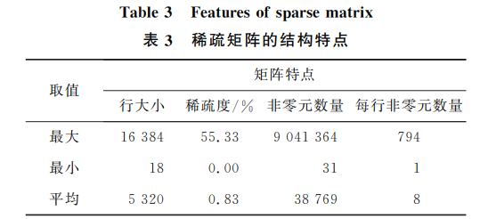 組 3 矩陣數量為 1453 個,占比 56.7%。該組矩陣的特點是矩陣規模相對較小,但非零元數量遠大于其他組。每行非零元數量平均為 11,非零元分布非常不規律,讀取非零元列索引會頻繁引發 Cache 行替換,降低了處理器的吞吐量,從而影響 SpMV 算法性能。
