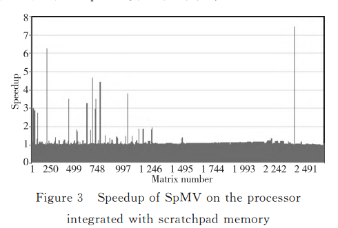 此外,在傳統多級 Cache 處理器中,Cache 缺失的延遲不固定,而在集成便箋式存儲器的處理器中對輸入向量 x 的訪問由便箋式存儲器完成訪存沖突更小,因此能夠實現更高的加速比。稀疏度超過平均值的 24 個矩陣,其矩陣規模較小,矩陣行數平均為 62,平均每行有 2 個非零元,可以通過一條 SVE 計算指令處理一行矩陣元素,能夠進一步減小對結果向量 y 的訪存開銷對于另外個矩陣,雖然矩陣規模更大,但非零元的分布非常均勻,使得計算過程中訪存沖突較少,因而該組矩陣性能最好。