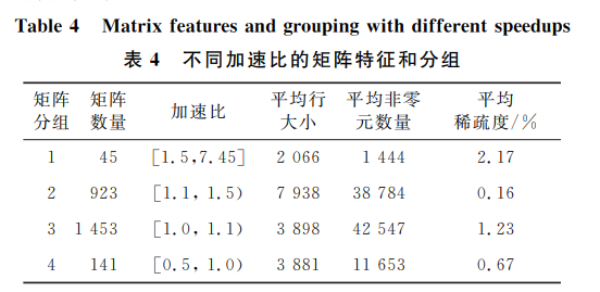 為了更加詳細地分析便箋式存儲器在不同特征矩陣下 SpMV 算法的性能影響,本文對測試的 2562 個矩陣,根據 SpMV 算法獲得的加速比進行劃分,分成 4 個組,編號為 1~4,不同矩陣的基本特征如表 4 所示。