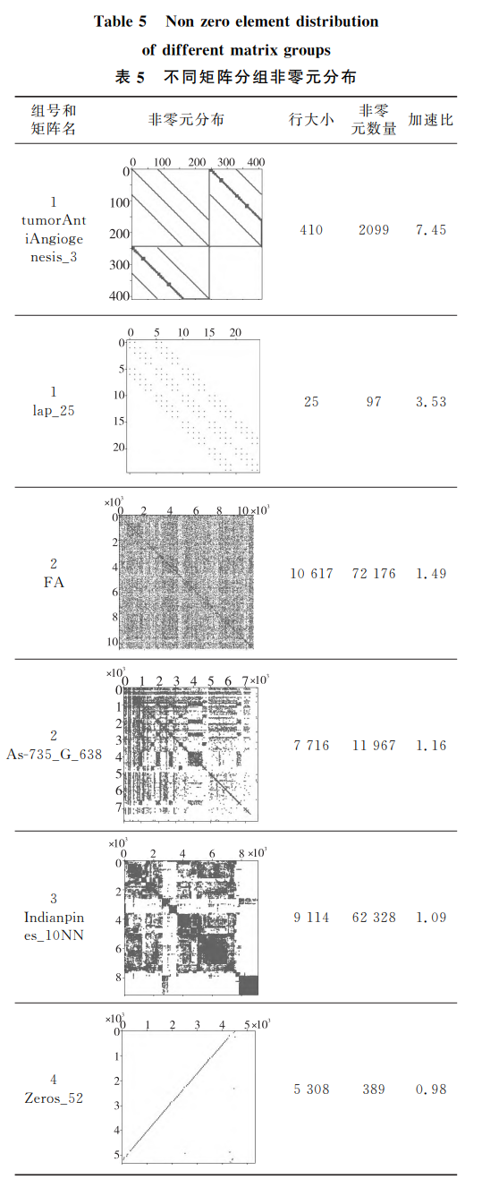 在集成便箋式存儲器的處理器中執行 SpMV 算法,加速比超過 1.5 的矩陣共 45 個,占比 1.76%。組 1 矩陣的特點是:矩陣行數最大為 13332,非零元最大數量為 5472,稀疏度最大為 15.52%。矩陣非零元數量小,非零元分布比較規律,如表 5 編號 1 的 2 個矩陣,能夠實現最高的 SpMV 加速比。