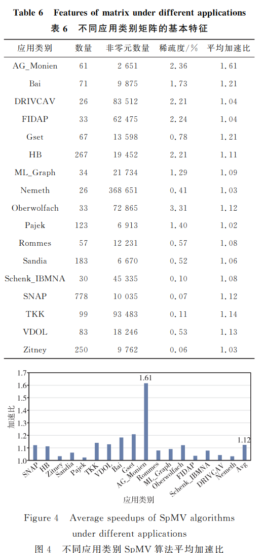 為了進一步分析便箋式存儲器對不同應用領域下 SpMV 算法的加速效果,本文將測試矩陣按照所屬應用類別進行劃分。所有測試的 2562 個矩陣共包含 99 個應用類別,矩陣數量超過 20 個的應用類別共 17 個,矩陣總數為 2221,其比例為矩陣總量的 86.69%,不同類別矩陣的基本特點如表 6 所示。