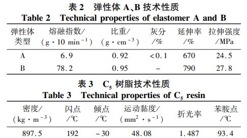 1. 1. 2 彈性體材料 選用彈性體 A、彈性體 B 及 C5 樹脂,技術指標見表 2、表 3。