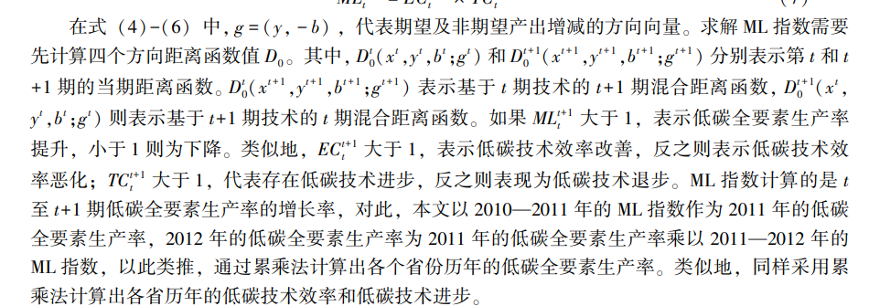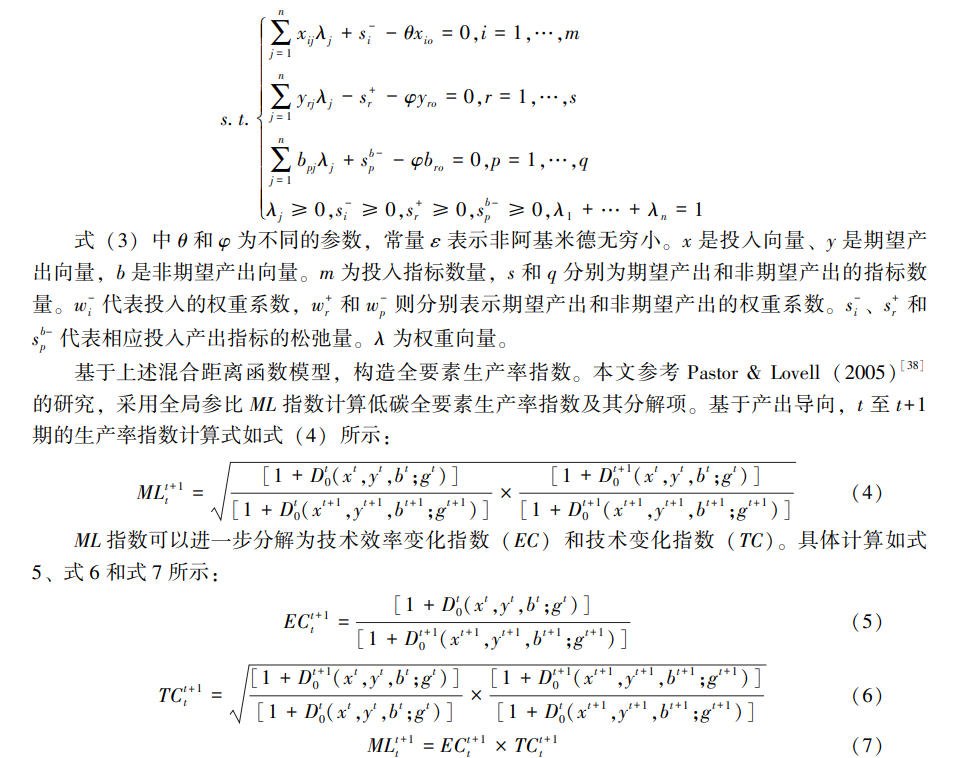 2.被解釋變量:低碳全要素生產率 本文基于數據包絡分析方法 (DEA) 測度低碳全要素生產率 (CTFP)。存在二氧化碳排放等非期望產出的情形下,能源消費投入和二氧化碳排放之間通常是 “徑向” 關系,但傳統的勞動、資本投入和產出之間通常存在 “非徑向” 關系,基于 SBM 距離函數的 DEA 方法難以處理同時存在非徑向和徑向的投入產出關系。因此本文采用 Tone & Tsutsui (2010) 提出的混合距離函數模型,即包含徑向距離函數和 SBM 距離函數的混合模型 (Epsilon - Based Measure,EBM) 以克服 SBM 模型的不足。在規模報酬可變 (VRS) 的情況下,其具體計算如式 (3) 所示: