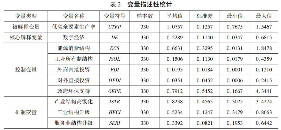 由于數字經濟測度中部分指標的原始數據從 2011 年才開始報告, 因此本文綜合考慮數據的連 續性和可得性, 選擇 2011—2021 年中國 30 個省 (區、 市) (未含西藏和港澳臺) 作為主要研究樣本。 各省二氧化碳排放計算所需的原始數據來源于 《中國能源統計年鑒》。 數字經濟測度所需的數 據來源于 《中國統計年鑒》 《中國工業統計年鑒》 《中國高技術產業統計年鑒》 以及國家統計局網 站。 其余變量計算所需的數據來源于 《中國第三產業統計年鑒》 《中國對外直接投資統計公報》 和各省歷年統計年鑒。 對于部分變量在少數年份的數據缺失, 本論文采用插值法或以年平均增長 率進行推測和補充。 表 2 給出了所有變量的描述性統計