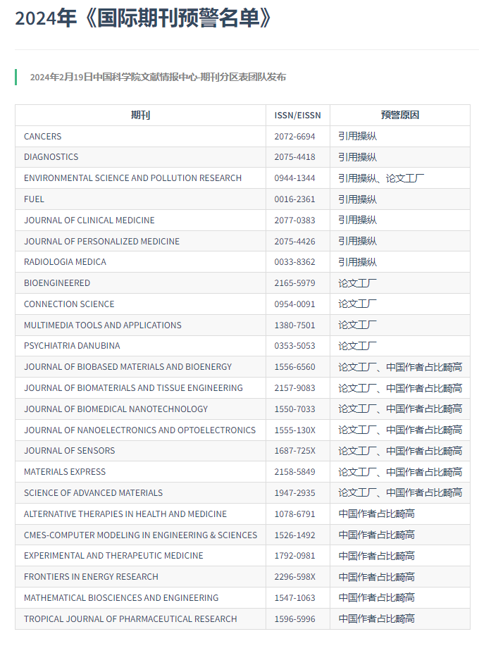 2024年《國際期刊預警名單》聚焦兩類問題: