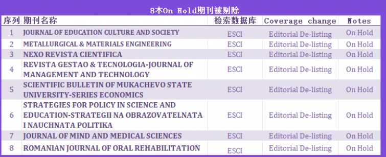 科睿唯安公布了2025年7月的Web of Science核心期刊目錄。這8本On Hold的ESCI期刊被剔除,剔除原因均是 Editorial De-listing(不滿足收錄的質(zhì)量標(biāo)準(zhǔn))。